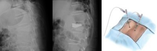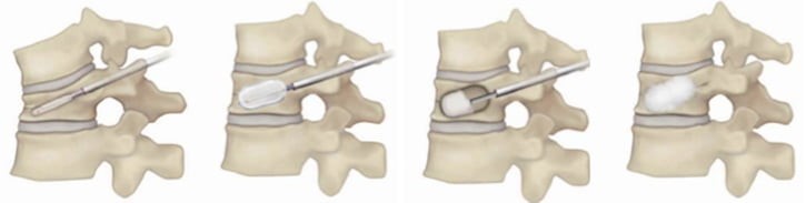 つぶれてしまった椎体に5㎜程度の小さな傷から細い針を挿入し、その針先から風船を膨らませて骨の形を戻します。
